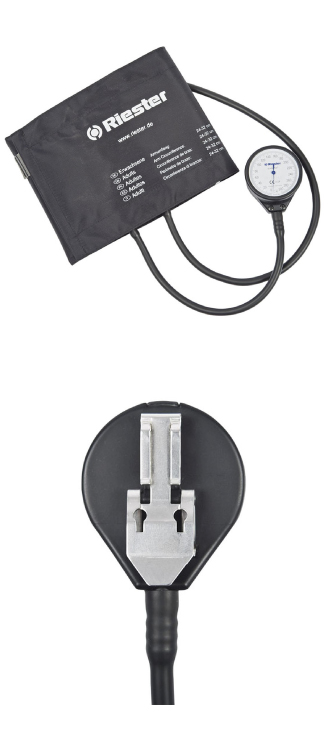 Exacta®: el esfigmomanómetro de dos tubos y con brazalete adaptado de Riester que viene con un firme carcasa metálica ahora es más pequeño y más ligero que su predecesor.