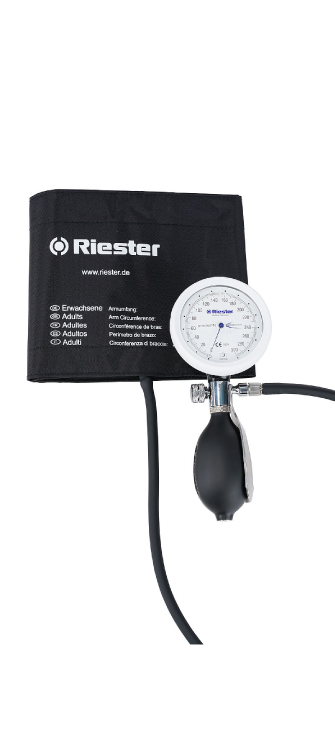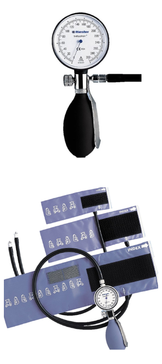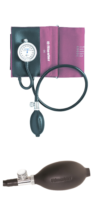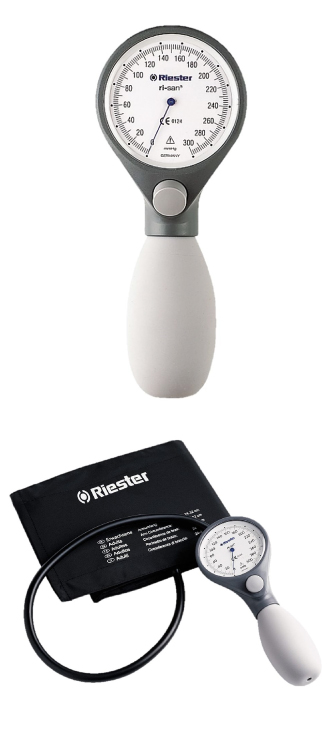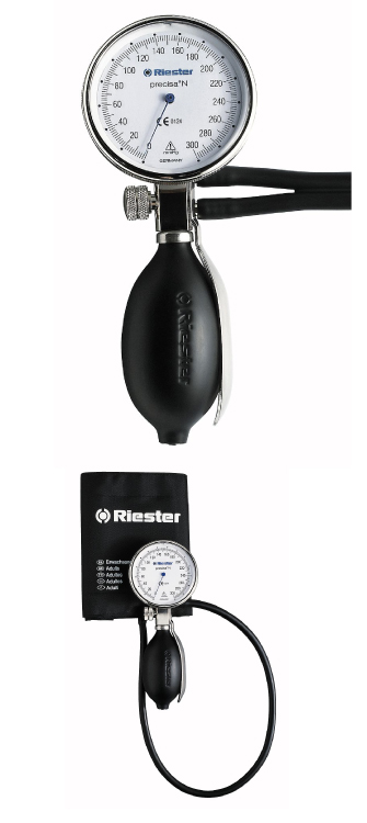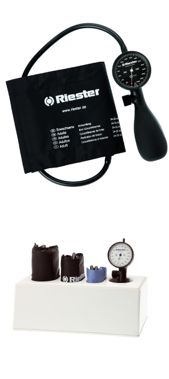 Exacta®: el esfigmomanómetro de dos tubos y con brazalete adaptado de Riester que viene con un firme carcasa metálica ahora es más pequeño y más ligero que su predecesor.