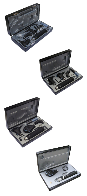 Otoscopios y oftalmoscopios e-scope® están disponibles en un estuche resistente a golpes o en una bolsa que ahorra más espacio, incluyendo accesorios (espéculos para el oído).